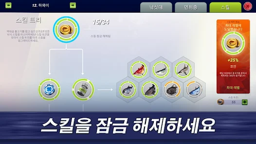어장마다 독특한 스킬 트리가 있습니다. 스킬 토큰을 사용해 새로운 스킬을 해제하고 보너스를 획득해 더욱 희귀한 물고기를 만나보고 더 많은 혜택을 누리세요! 어떤 물고기를 잡든, 슈퍼스타 낚시꾼이 되는 데 도움이 될 것입니다!