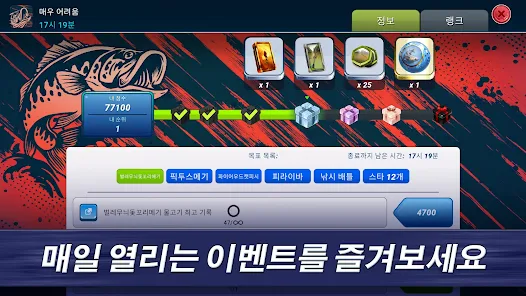 일일 또는 주간 이벤트에서 새로운 낚싯대, 미끼 카드, 스킬 토큰 등 놀라운 보상을 획득할 수 있습니다. 낚시 시험을 통과하고, 성난 상어에게도 도전해보고, 메기 사냥꾼도 되어보세요!