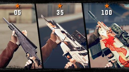 Weapons with different types of sniper guns but it is also the most expensive thing in the game. However, each gun has its own options for upgrading. Each item also has its level, later upgrades will cost more. A gun will have items that need improvement, such as silencer, gun head, bullet, gun body, stock, sight, magazine. The more you upgrade, the more powerful the gun becomes.