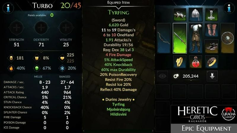 Heretic Gods의 매우 중요한 측면은 전리품입니다. 도끼, 투구, 장갑, 부츠, 갑옷, 방패, 활, 검, 반지 등 수백 가지의 다양한 물건을 찾아 장착할 수 있습니다. 또한, 마을에서는 주민들과 거래를 하거나 자신만의 아이템을 제작할 수도 있습니다.